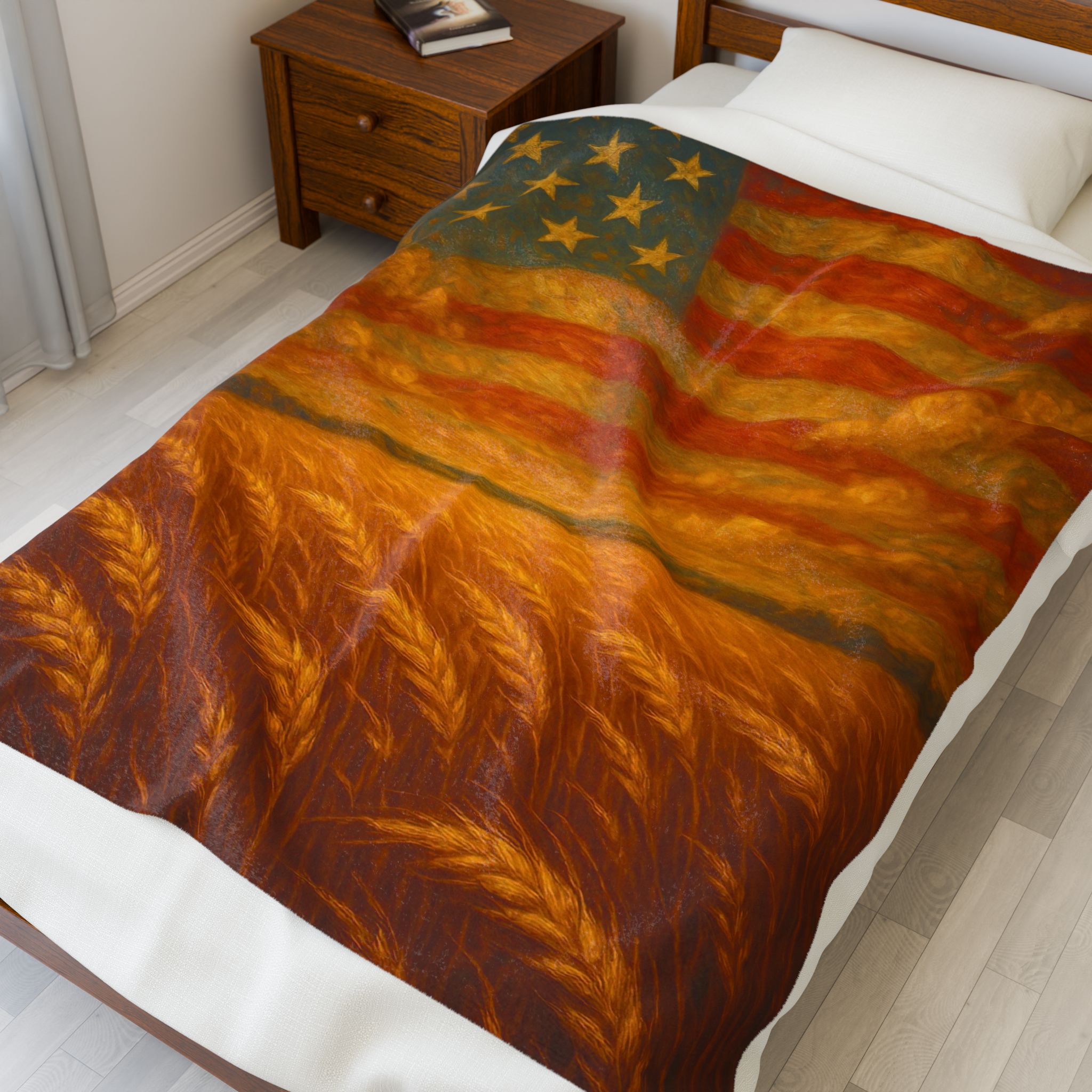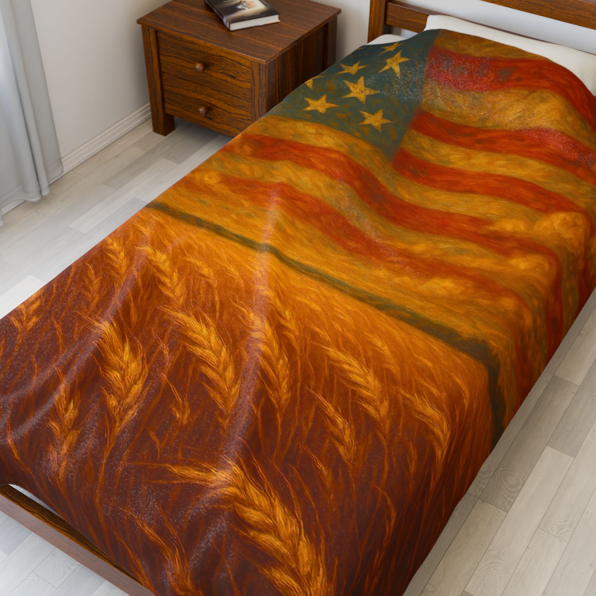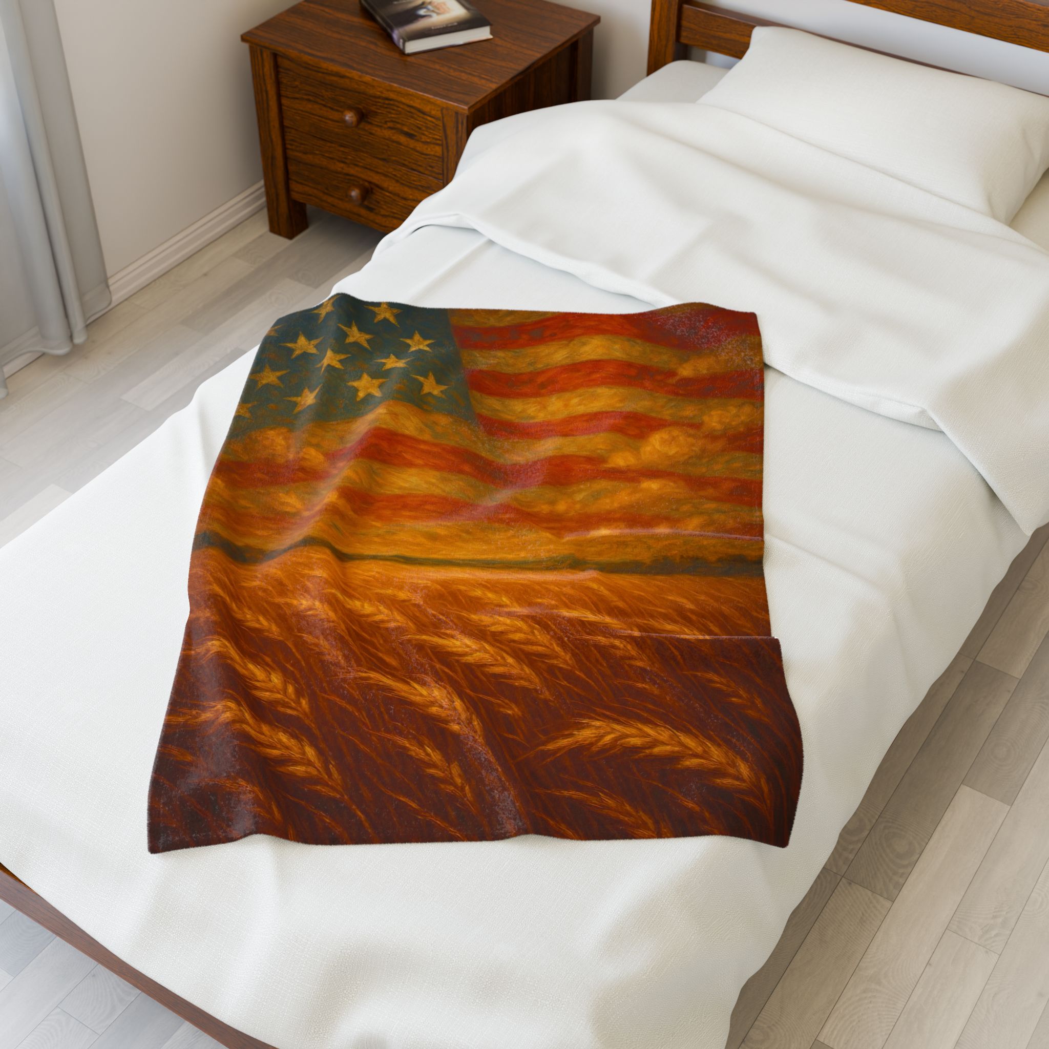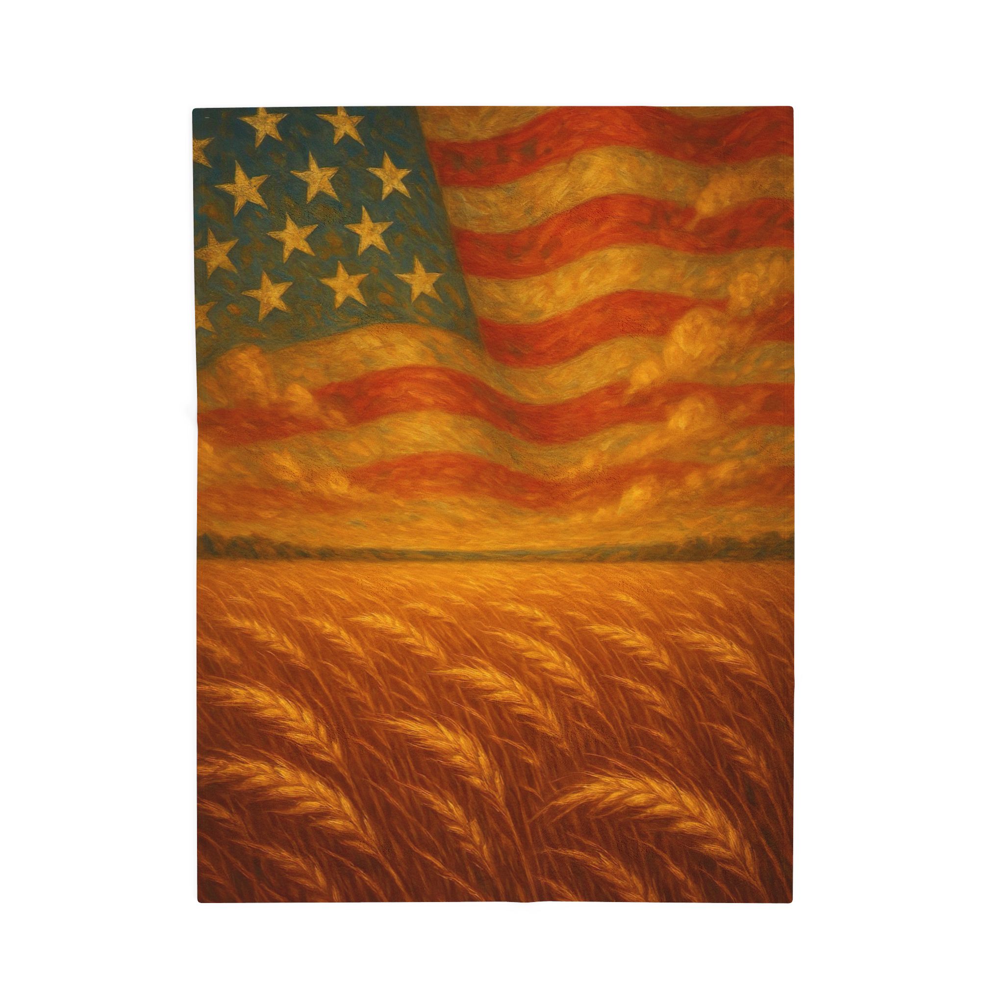 america the beautiful blanket, patriotic flag throw blanket, american wheat field decor, 4th of July home accent, liberty theme throw, rustic american flag art, heritage pride blanket, independence day bedding, country style patriotic decor, veteran gift USA, americana wall throw, freedom inspired blanket, stars and stripes bedding, wheat and flag blanket art, farmhouse liberty home gift