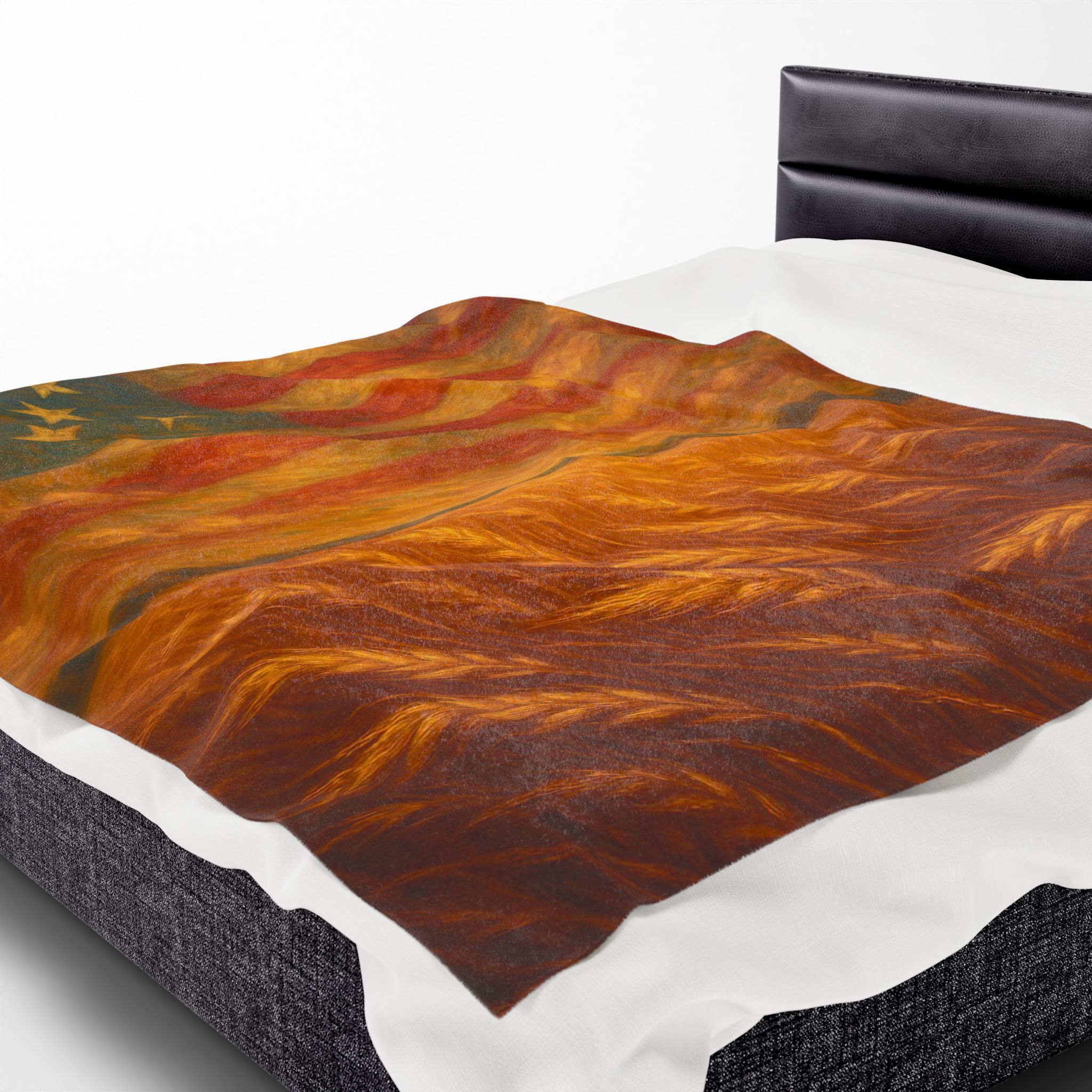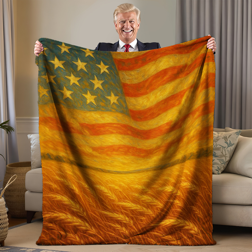 Featuring a hand-painted style American flag rising above golden fields of grain, this powerful design captures the spirit of freedom in one stunning, cozy keepsake. Whether draped on your couch, gifted to a veteran, or displayed during 4th of July celebrations, this blanket radiates warmth — both literal and symbolic.