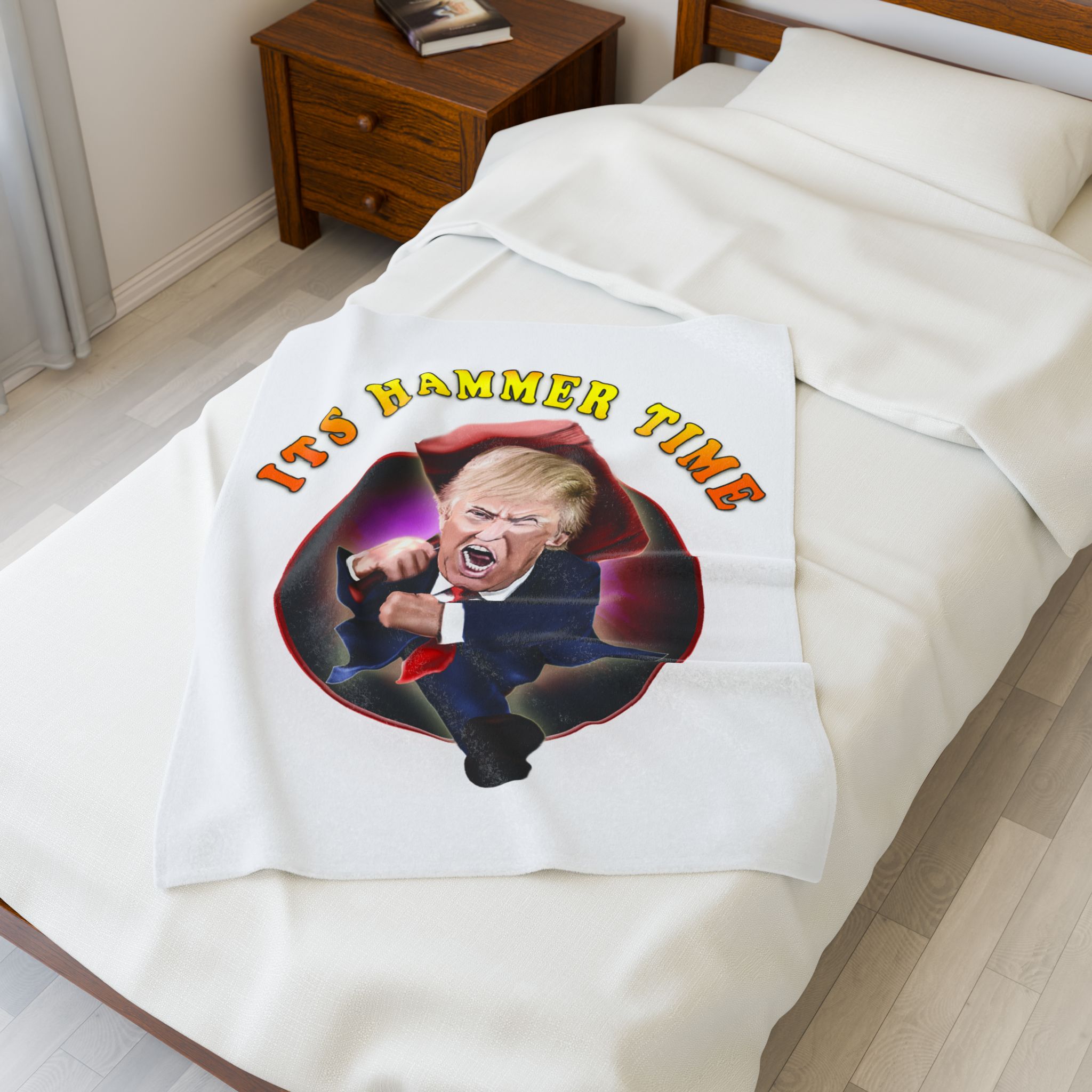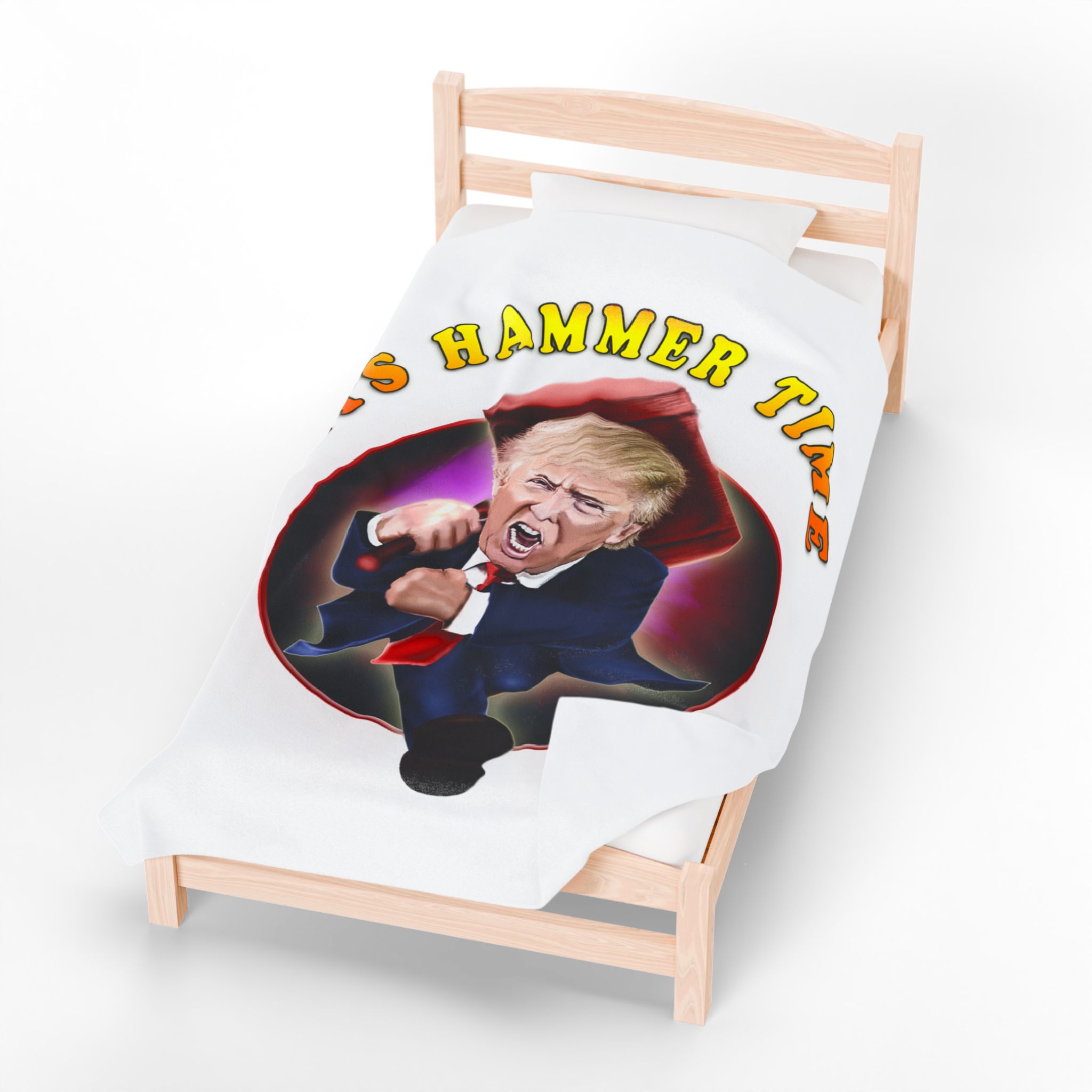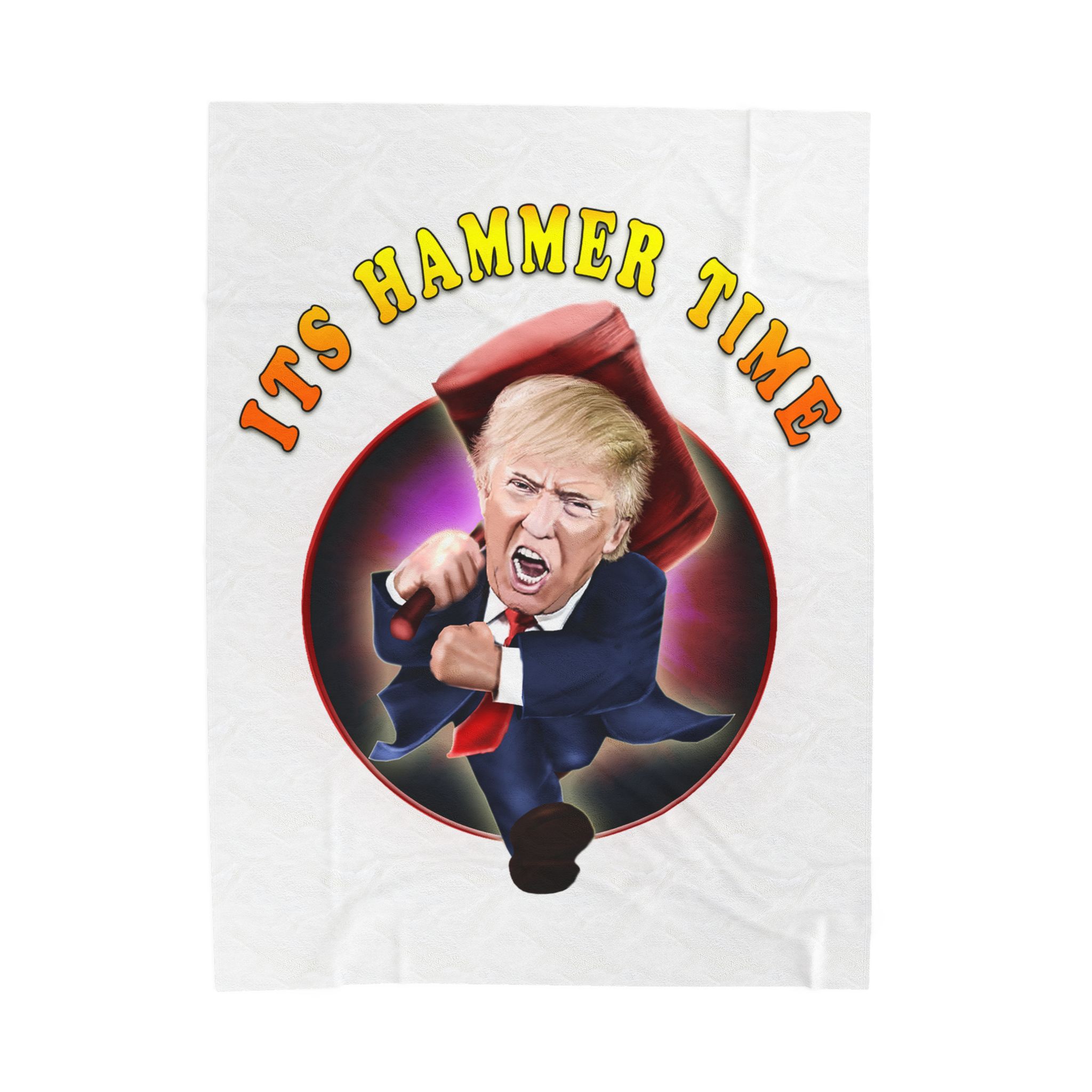 Add a punch of humor and bold personality to your living space with this hilarious “It’s Hammer Time” Donald Trump blanket. Featuring a vivid, caricature-style design of Trump charging forward with an oversized hammer, this throw blanket is the ultimate statement piece for political humor fans, conservatives, and Trump supporters.