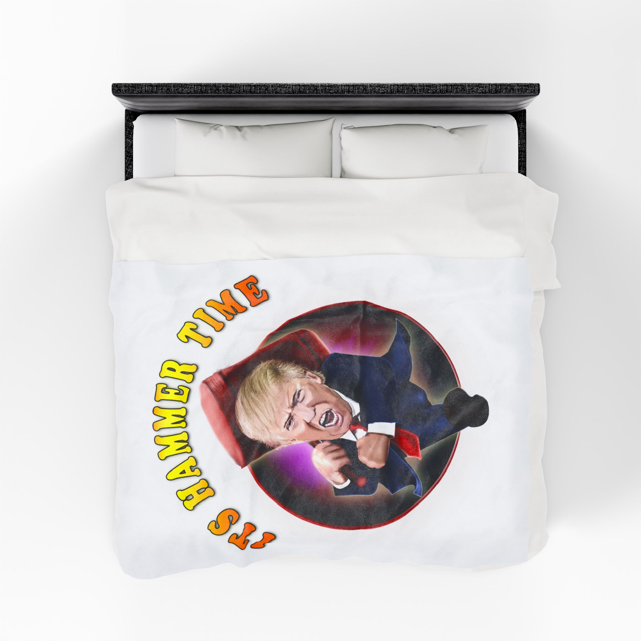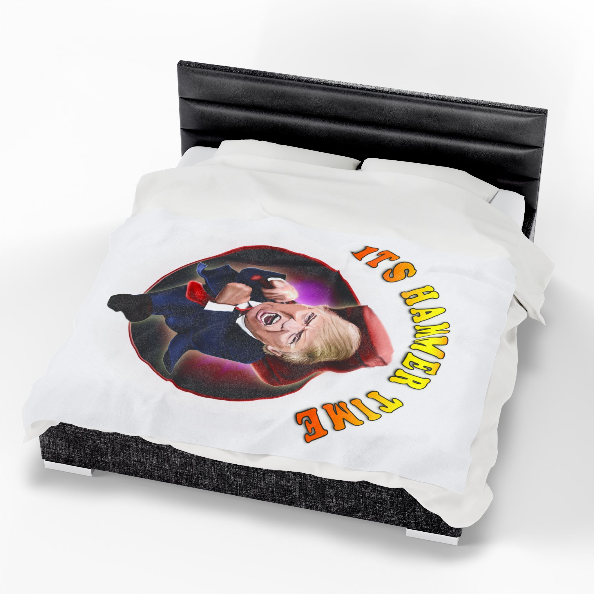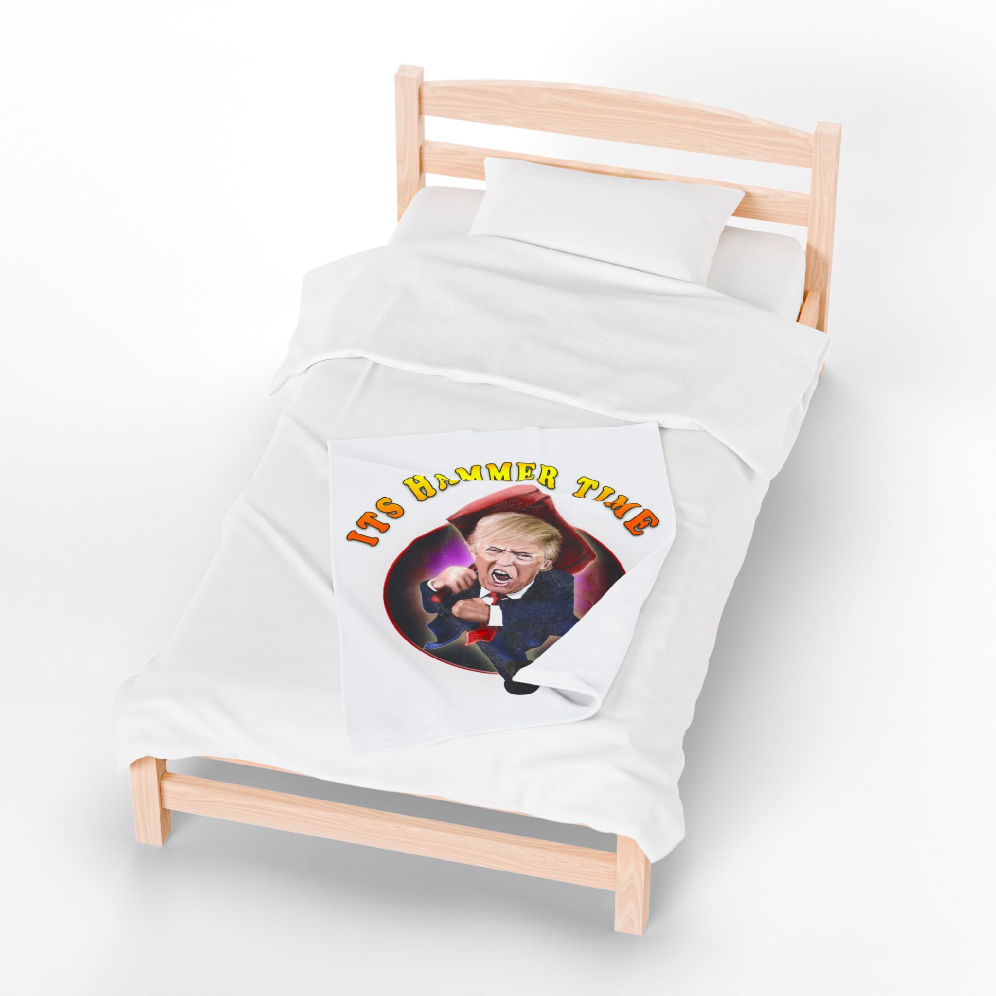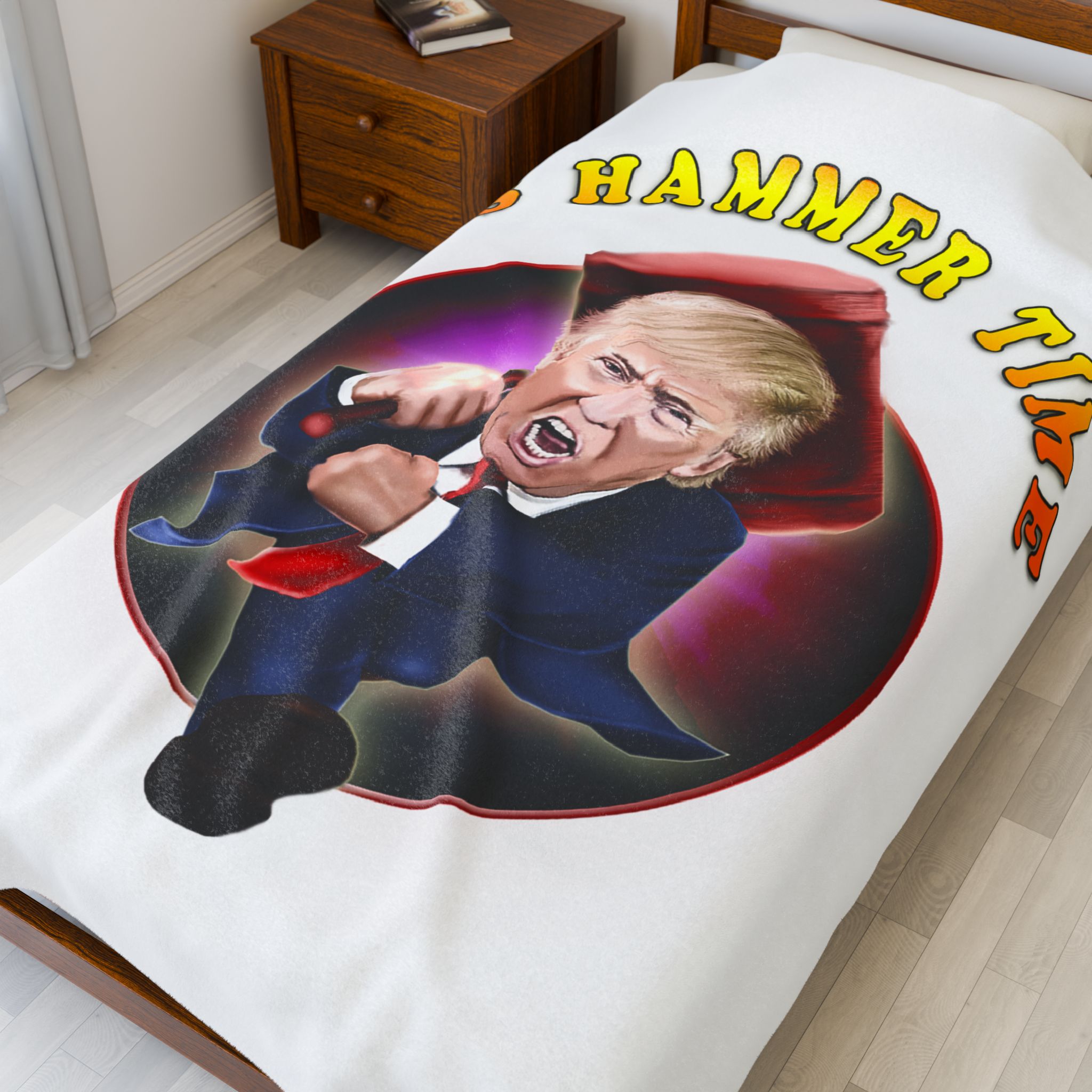 Add a punch of humor and bold personality to your living space with this hilarious “It’s Hammer Time” Donald Trump blanket. Featuring a vivid, caricature-style design of Trump charging forward with an oversized hammer, this throw blanket is the ultimate statement piece for political humor fans, conservatives, and Trump supporters.
